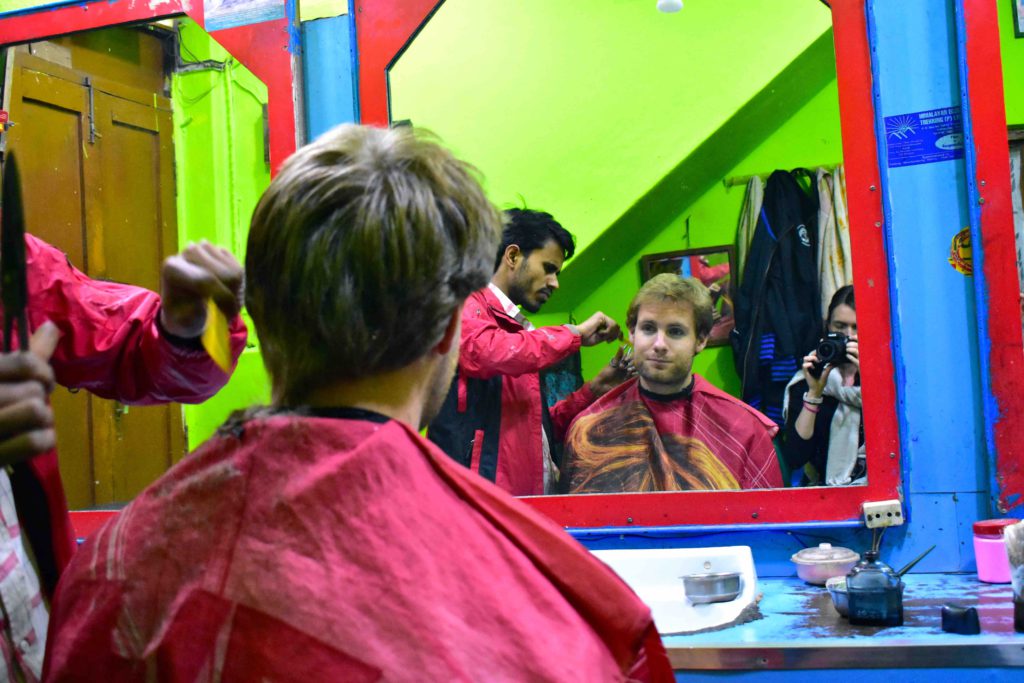 François, lui, a décidé d’aller expérimenter … LE COIFFEUR NÉPALAIS ! Tu rigoles mais je t’assure que c’est une expérience à part entière ! Le salon de coiffure ne paye pas de mine. Le népalais commence à couper les cheveux de François. Après environ 1/2 heure c’est enfin fini. Il s’attaque ensuite à sa barbe. Là, je fais un bond de ma chaise. Une souris vient de passer entre mes pieds… Une fois la barbe et les cheveux coupés, le coiffeur sort tout un attirail de crèmes qu’il applique sur la tête et le visage d’une façon très très énergique !! Le fou rire assuré ! Au final le résultat est très satisfaisant. Tout va bien qui finit bien !