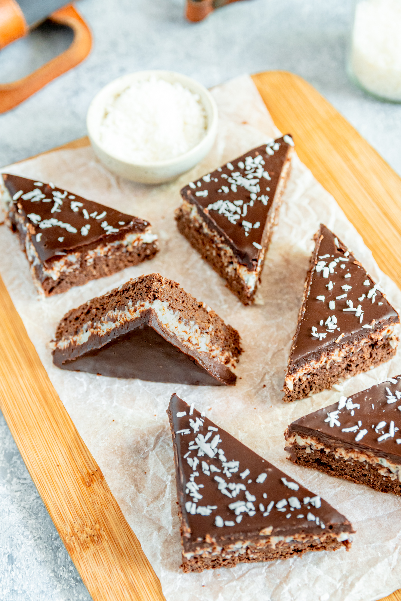 9. Démoulez votre gâteau Bounty et coupez des carrés à l’aide d’un couteau préalablement passé sous l’eau chaude puis essuyé afin d’obtenir des parts nettes et précises