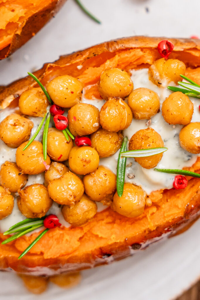 - L’assemblage : Déposez la sauce au fromage dans vos patates douces, répartissez les pois chiches et ajoutez quelques baies roses.