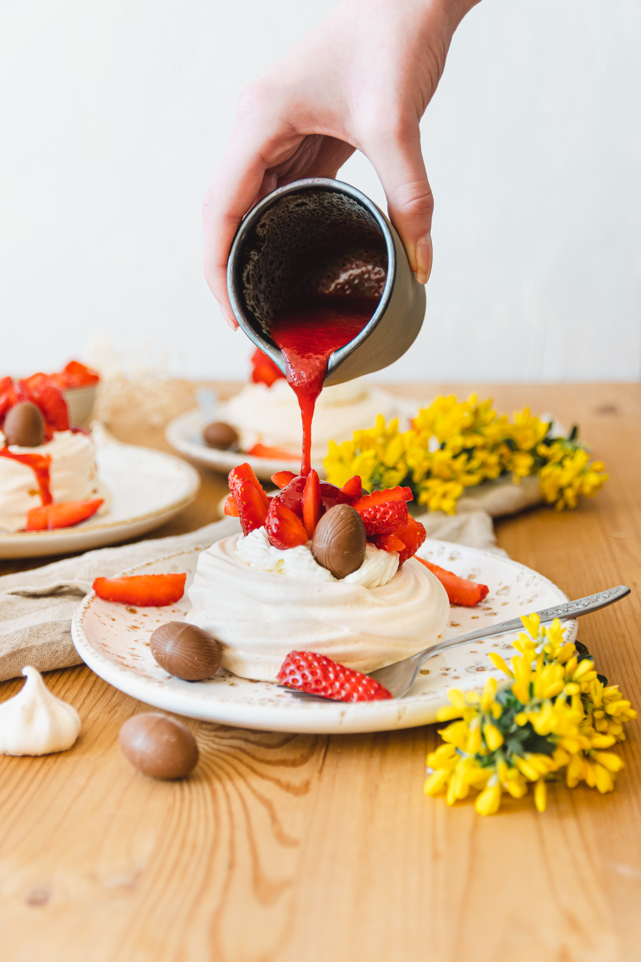 Vous avez dit Pavlova aux fraises ?! Un vrai délice ! C’est la saison des fraises et en plus c’est Pâques ! Alors, j’ai imaginé ces petits nids de meringues fourrés de crème mascarpone avec quelques gariguettes de Plougastel et un bon coulis. À vos ustensiles. Prêts ? Cuisinez !