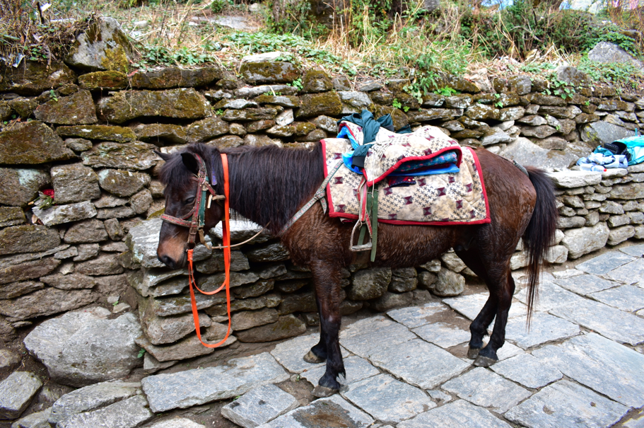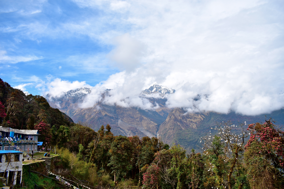 Il reste encore des marches à monter en quittant Ulleri. Nous croisons quelques ânes et chevaux chargés de nombreux sacs approvisionnant les villages plus hauts. Nous passons Banthanti et nous arrivons dans la jungle. Nous pouvons voir quelques chutes d’eau et passons plusieurs ponts. La forêt est super jolie. Les arbres apparaissent violet et la brume rend l’atmosphère mystique. Nous arrivons à Nangethanti. Nous commençons à apercevoir des rhodondendrons au milieu des autres arbres, puis au fur et à mesure que l’on monte, ils se multiplient pour constituer l’essentiel de la forêt. Ils sont rouges ou roses pour la plupart et quelques uns sont blancs. Ils sont magnifiques. Nous arrivons finalement dans le village où nous allons passer la nuit : Ghorepani. Les toits des maisons sont en tôle de couleur bleue. Il est midi, peu de trekkeurs sont arrivés. Nous n’avons mis que 3h15 de Ulleri à venir ici malgré les 1000 m de dénivelé. Pancake compacte mais magique finalement ?! Place au déjeuner. Je suis affamée. Je commande des spring rolls aux légumes. Petit coup de barre = petite sieste d’après manger. L’orage et la pluie me réveillent. Il ne fait pas très chaud dans la chambre, je m’installe donc dans le salon où chauffe un poêle à bois encerclé par les vêtements trempés des trekkeurs. Nous restons au coin du feu durant la soirée avant de nous glisser sous les couettes. Demain, l’ascension pour le fameux point de vue sur l’Himalaya nous attend.