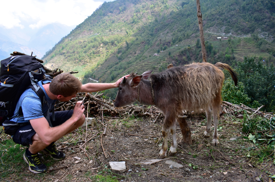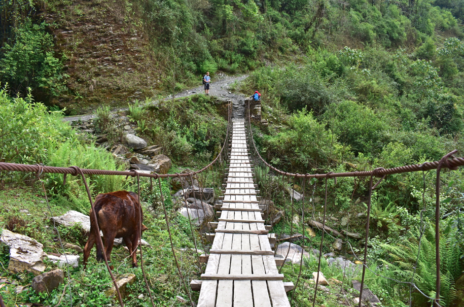 Il est 10 H, nous sommes les derniers à partir du village, ce qui est finalement une bonne chose car nous sommes tout seuls sur le sentier du trek.Une bonne descente nous attend avant d’atteindre Ghandruk. Nous quittons petit à petit la jungle et commençons à apercevoir les rizières. Je descends tout doucement, mes chevilles tremblent. J’ai l’impression de m’être transformée en Flamby. Nous arrivons à Ghandruk le deuxième plus grand village des Annapurnas. Ici, vit le peuple Gurung : une ethnie himalayenne. Il y a des musées à visiter mais nous restons seulement pour déjeuner et nous repartons en direction de Landruk. Nous avons une vue sur la vallée et la rivière en contrebas. Nous entamons une grande descente avec des marches, et oui encore des marches. En bas, je retrouve François en train de jouer avec des bébés chèvres. Ils sont tellement mignons ! Il ne nous reste plus qu’à traverser la rivière via un pont et à monter les escaliers menant à Landruk. 1 H s’écoule. Ce n’est pas la partie du trek la plus facile mais nous arrivons à destination. Étonnant, ici il y a beaucoup moins de monde. Landruk est un village de fermiers, les animaux se promènent en liberté et sont tous aussi rigolos les uns que les autres. Nous déposons nos affaires dans une guesthouse. Je m’empresse alors de plonger mes pieds tout rouges dans un sceau d’eau chaude. Ça fait tellement de bien ! Nous prenons un dîner une fois la nuit tombée et ne tardons pas à aller se coucher.