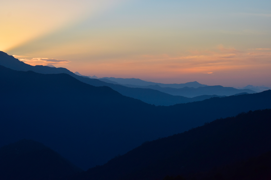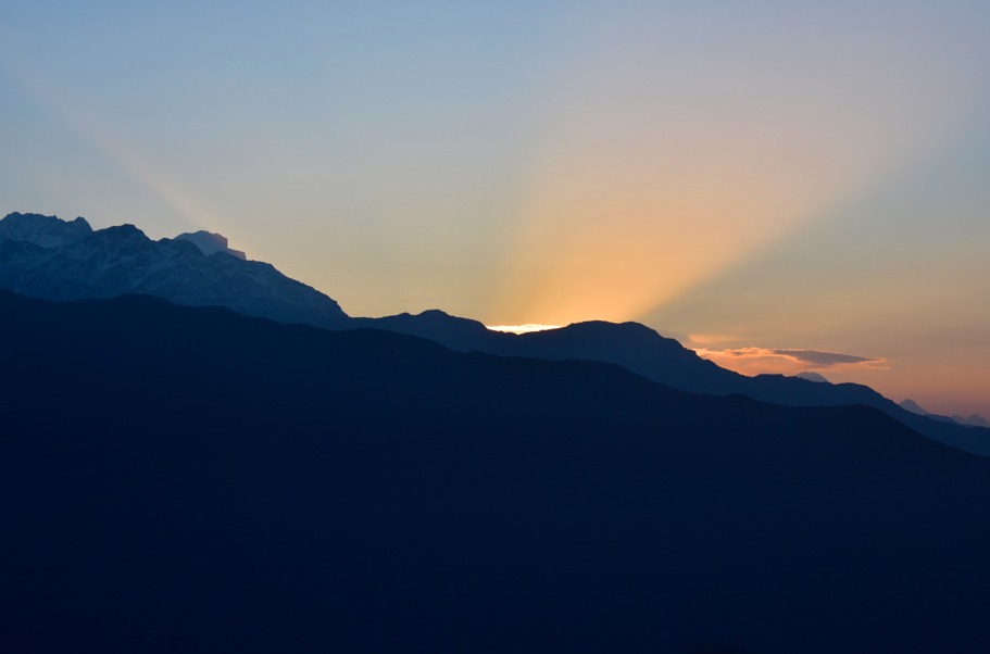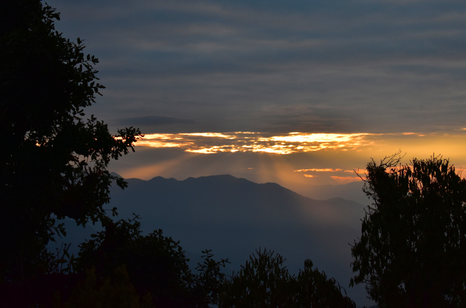 Cette partie du trek est beaucoup plus sauvage. Nous sommes au beau milieu de la jungle. C’est vraiment super chouette ! Quelques descentes, quelques montées. La dernière est assez dure et épuisante. Nous arrivons à Tadapani. Beaucoup de maisons de thé sont déjà complètes. Nous trouvons finalement une minuscule chambre. La pièce commune est dotée d’un poêle au plus grand bonheur de mes pieds. Le soleil pointe le bout de son nez et je prends place sur un banc pour admirer le panorama des montagnes enneigées qui s’offre à moi. Le coucher de soleil est superbe.