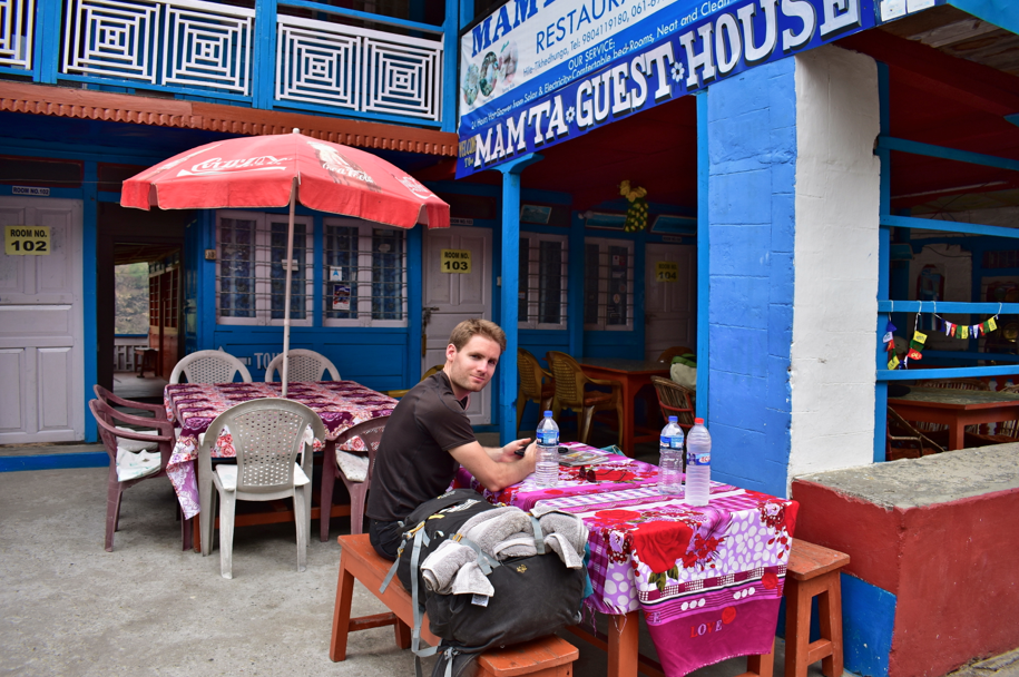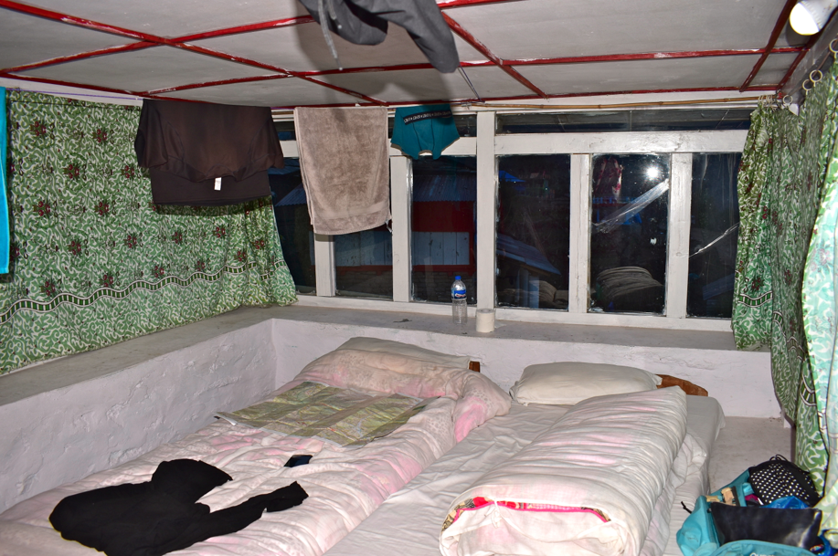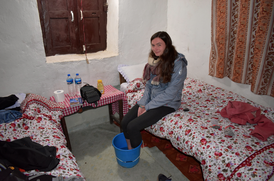 La chambre qu’on nous propose est correcte, sommaire mais nous n’en attendions pas autant pendant un trek donc nous sommes plutôt surpris. Le gérant nous propose de dormir dans cette chambre gratuitement à condition qu’on prenne et paye le dîner et le petit déjeuner chez lui. Le soleil est couché, il fait frais mais de grosses couettes sont à disposition.