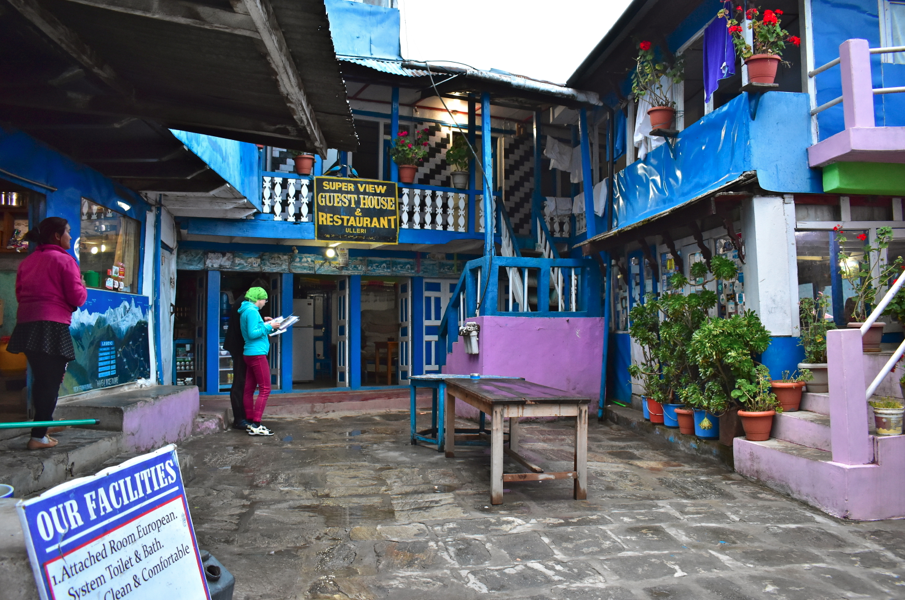 Nous choisissons notre logement un peu au hasard, les maisons de thé semblent se valoir. Le nom c’est : Super View Guesthouse Himalaya. Celle un peu plus haut, Super View Mountain et celle un peu plus bas Super View je sais pas trop quoi, bref elles ont toutes une Super View, encore faut-il que le ciel soit dégagé, ce qui n’est pas vraiment le cas pour l’instant !