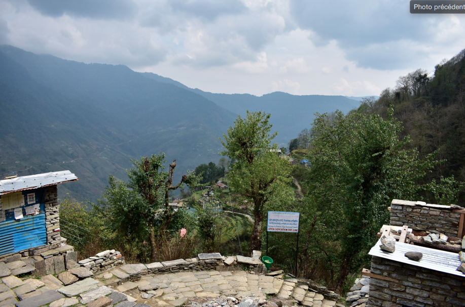 Nous passons devant le check point à Birethanti. Nous débutons par une bonne montée sur une piste avec 500 m de dénivelé. Il fait chaud, le soleil tape. Mes jambes ont l’air en forme, je monte assez facilement. Nous arrivons rapidement au premier village : Hile. Il y a de nombreuses personnes à effectuer le trek et toutes aussi différentes que les autres : des américains, des français, des chinois, des indiens et bien d’autres nationalités, des personnes âgées, des familles, des amis, des solitaires… et même des enfants qui se font trimbaler par des porteurs sur leur dos. Par contre, nous ne sommes pas beaucoup à porter notre sac nous même… Beaucoup font appel à un porteur et/ou à un guide.