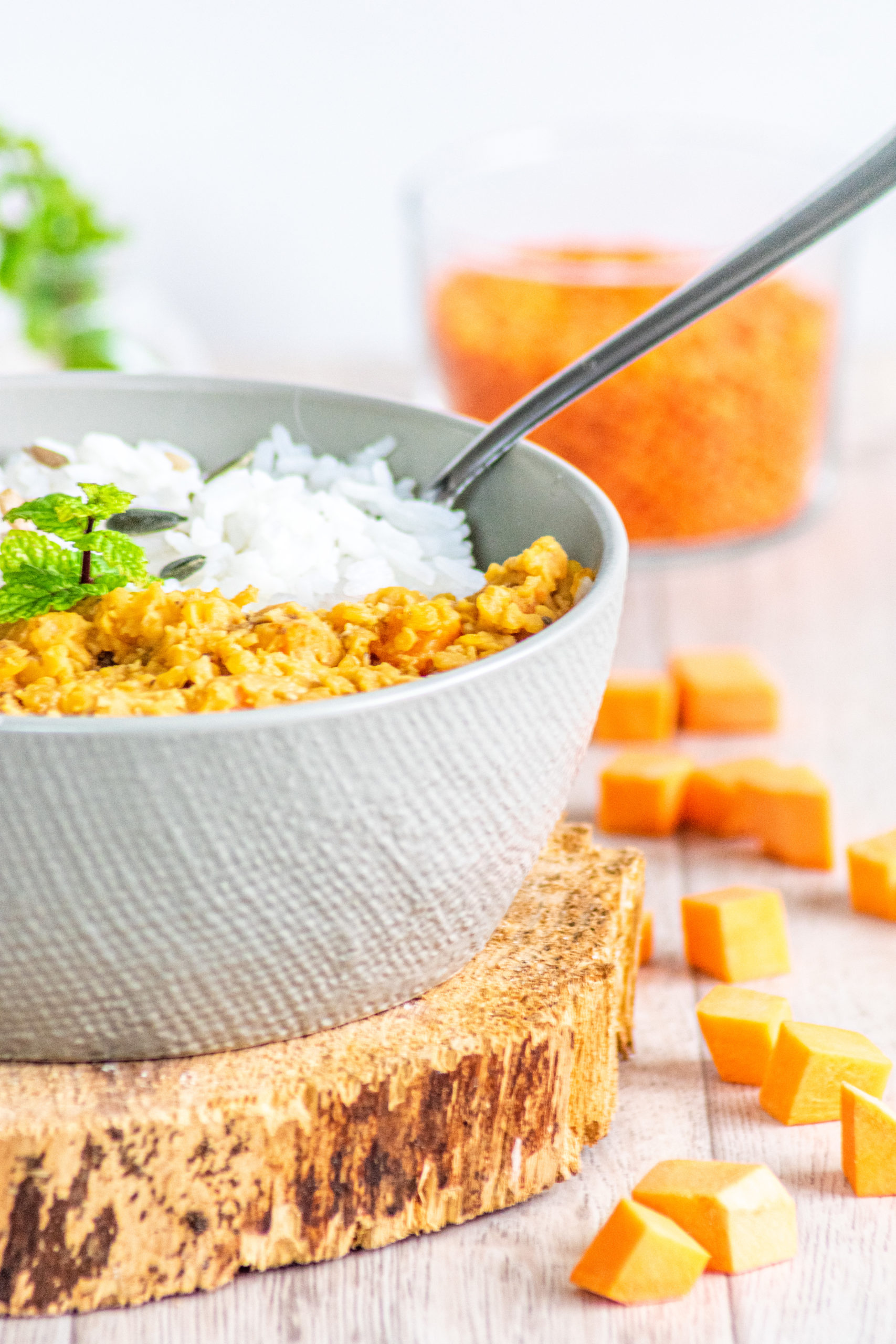 C’est lors de notre voyage au Népal que nous avons découvert le Dal Bhat. Ce plat traditionnel est composé de riz (bhat) et d’une soupe de lentilles (dal). C’est vraiment délicieux. En souvenir de cette belle découverte, j’ai décidé de créer une recette à base de riz et de lentilles corail. J’y ai ajouté des patates douces et du lait de coco. À vos ustensiles, prêts ? Cuisinez !