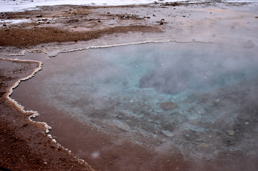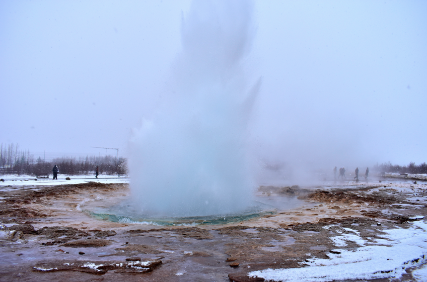 Nous repartons de Thingvellir en stop pour nous rendre au site de Geysir. La région est réputée pour ses nombreux geysers. Le plus célèbre est appelé Geysir et est à nouveau en activité depuis le tremblement de terre de 2000 mais son jaillissement est plutôt irrégulier. Non loin, on peut voir le geyser de Strokkur, très surprenant ! Il entre en éruption toutes les 10 minutes environ et son jet de vapeur peut monter jusqu’à 20-25 m de haut. Vous imaginez bien que je suis restée un bon moment les bras en l’air pour pouvoir le prendre en photo en pleine éruption 😉