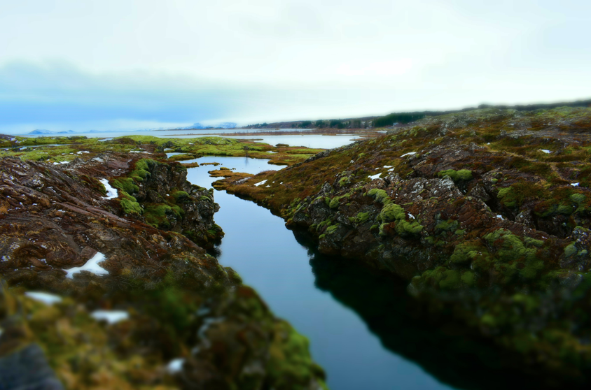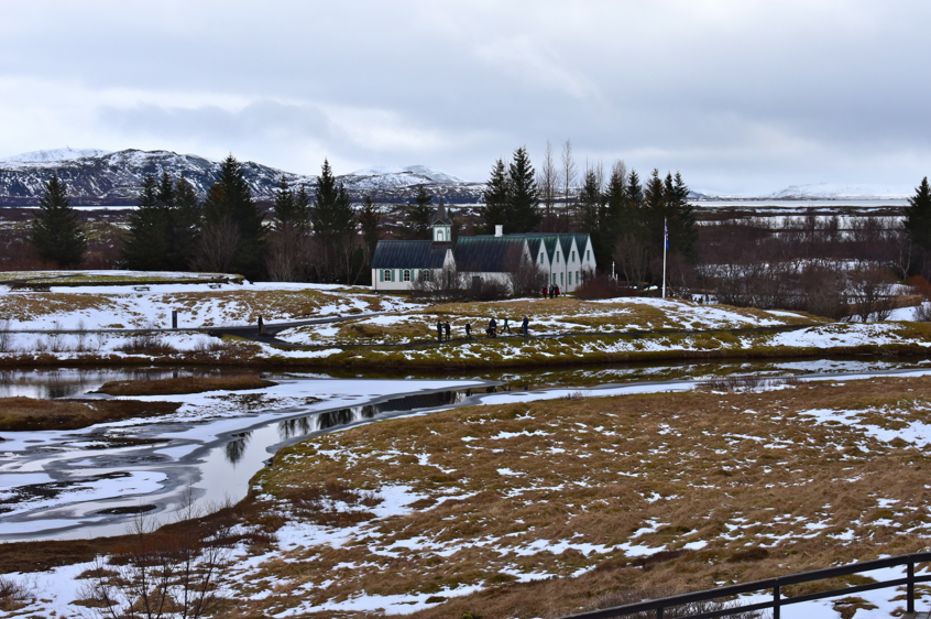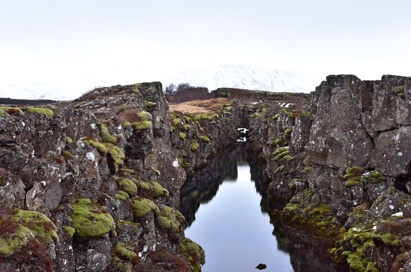 Thingvellir est connu comme l’endroit où a été implanté le premier parlement du monde. Mais pas seulement, ici nous sommes à cheval entre l’Amérique et l’Europe ! Dingue hein ? Le site est traversé par une vaste faille, un immense fossé qui sépare la plaque Eurasienne de la plaque Américaine. Regardez les photos !