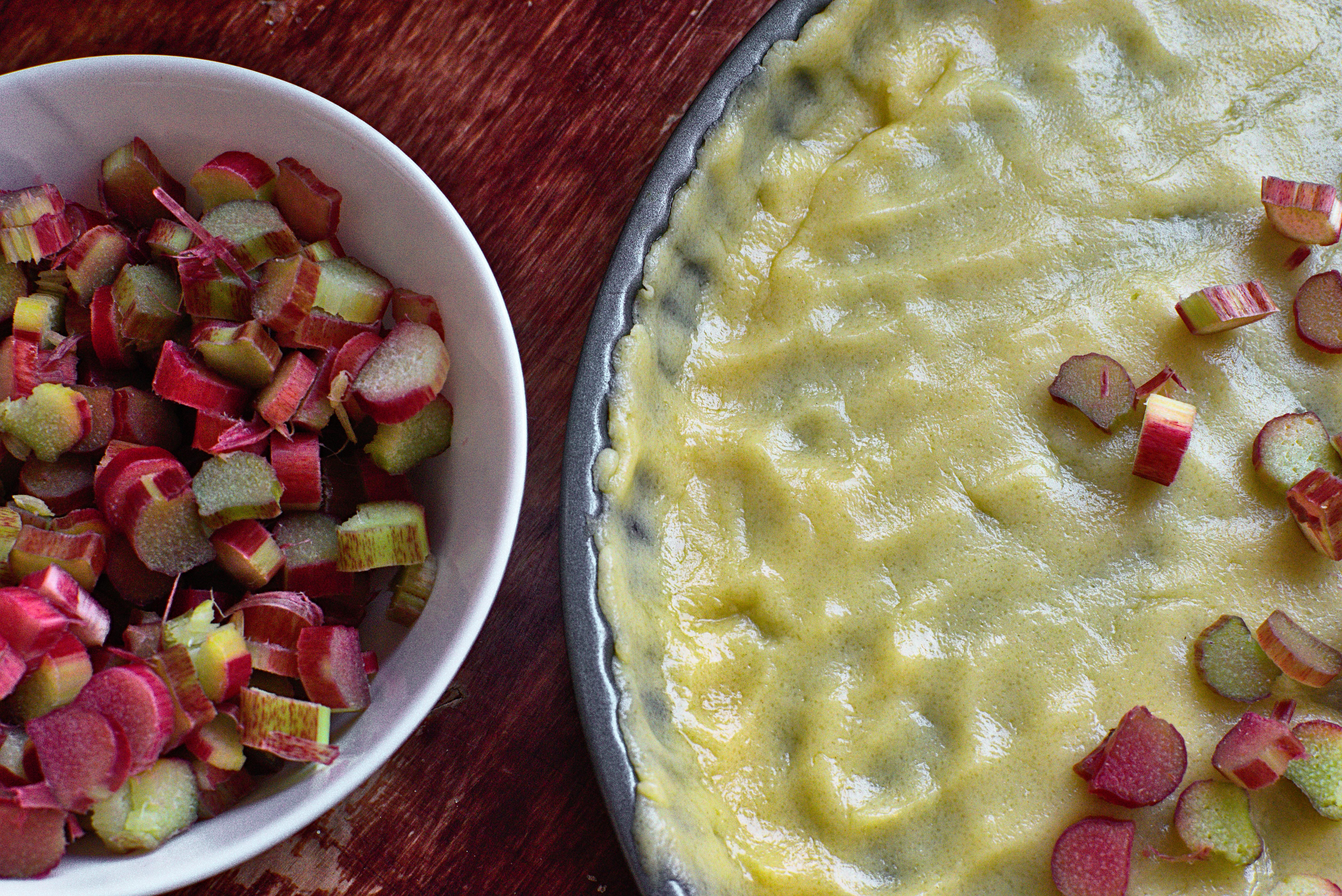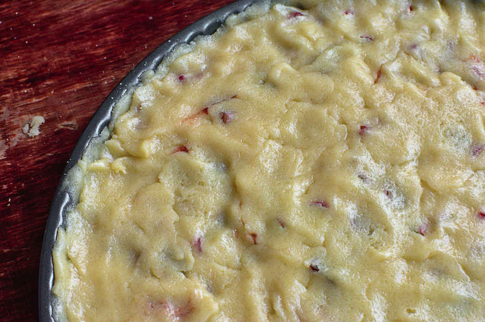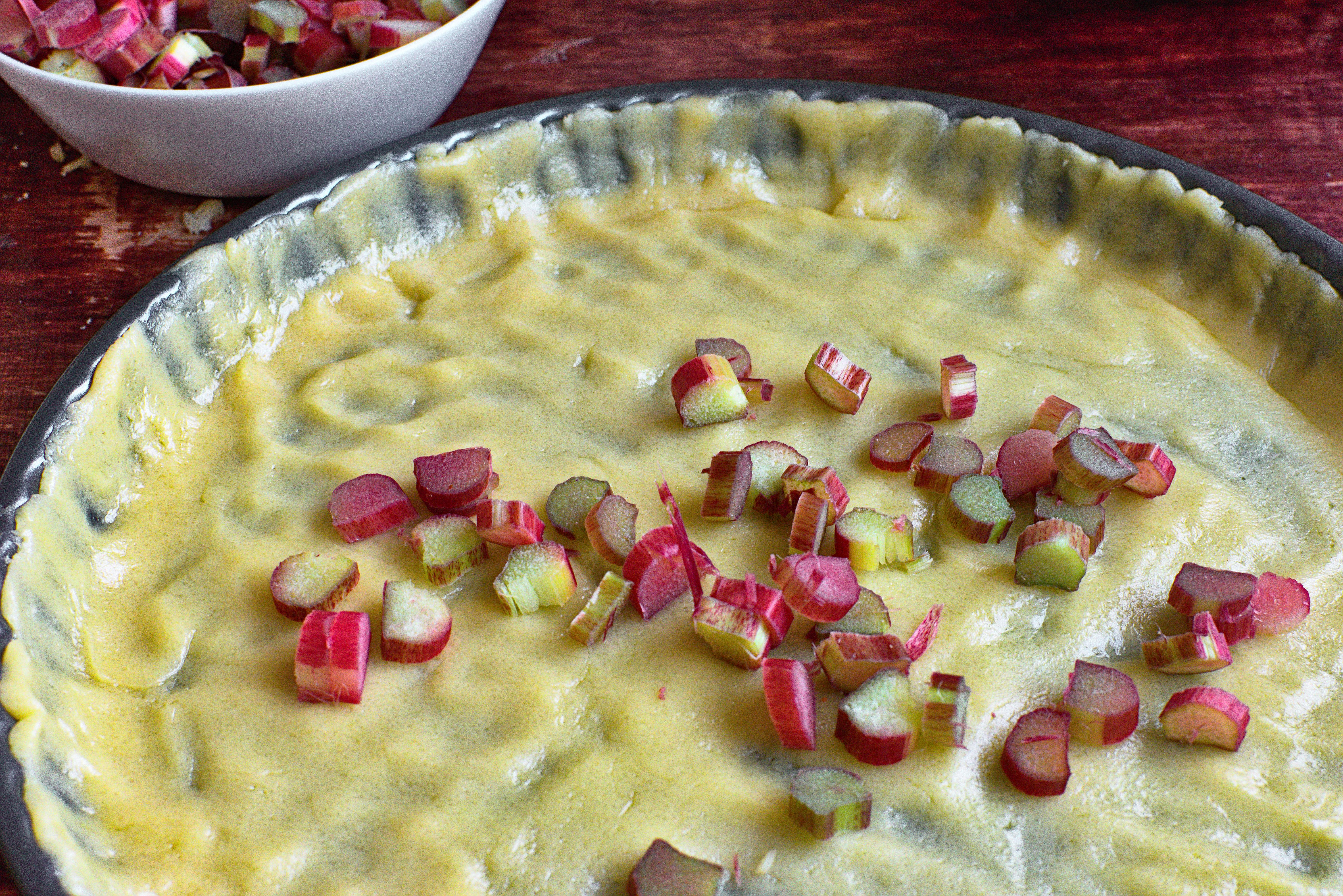 9- Répartir les morceaux de rhubarbe sur le fond de tarte.