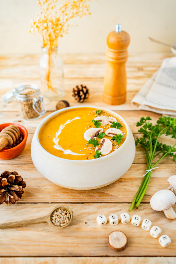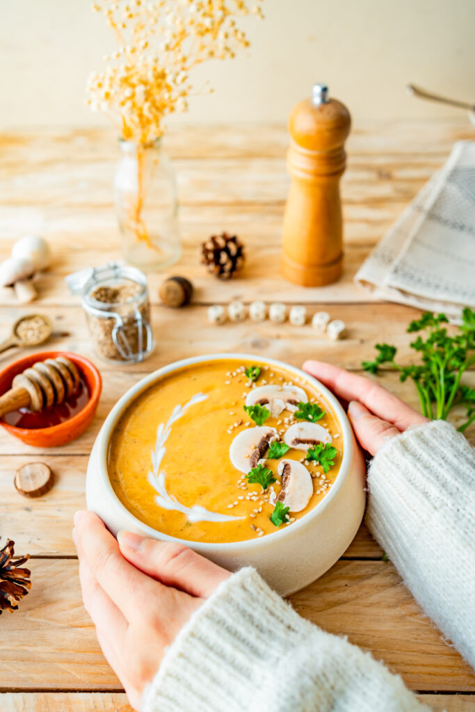 Le velouté de patates douces, champignons et miel est réconfortant et idéal pour l’automne. Les patates douces sont riches en bêta-carotène, bénéfique pour renforcer le système immunitaire. Le miel est la la petite touche en plus de ce velouté. Il apporte douceur et une pointe de sucrosité.