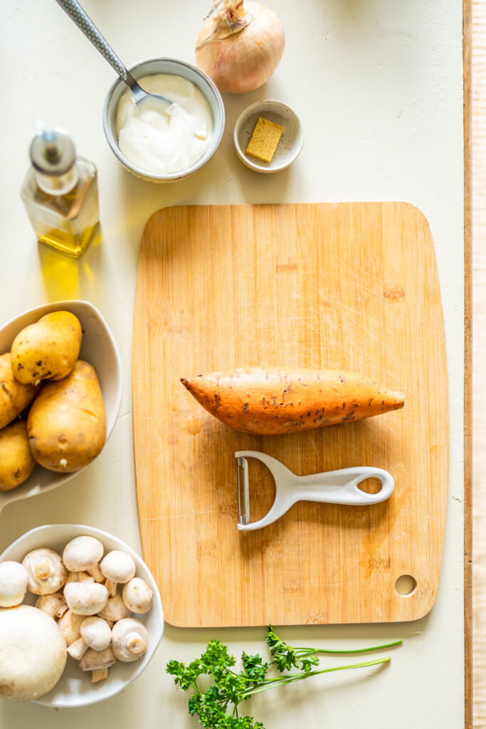 - Épluchez la patate douce et coupez-la en morceaux de taille moyenne.