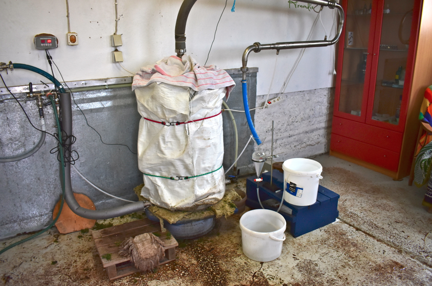 Le but est d’extraire les huiles essentielles de la plante aromatique choisie, ici le sapin. Il existe plusieurs techniques. Hraundis, elle, utilise la technique de distillation à la vapeur d’eau. Le procédé consiste à faire passer de la vapeur d’eau au travers d’une cuve remplie de branches de sapin. La vapeur d’eau extrait alors l’essence de la plante et forme ainsi un mélange homogène gazeux. Ce mélange traverse un tuyau en forme de serpentin et se condense sous l’effet d’une pression contrôlée. Le liquide obtenu atterrit dans une fiole. On peut ainsi voir l’huile essentielle qui flotte au dessus de l’eau puisque sa densité est inférieure. Il ne reste plus qu’à la recueillir et à la déposer dans des petites bouteilles. J’espère que mon explication est claire 😉