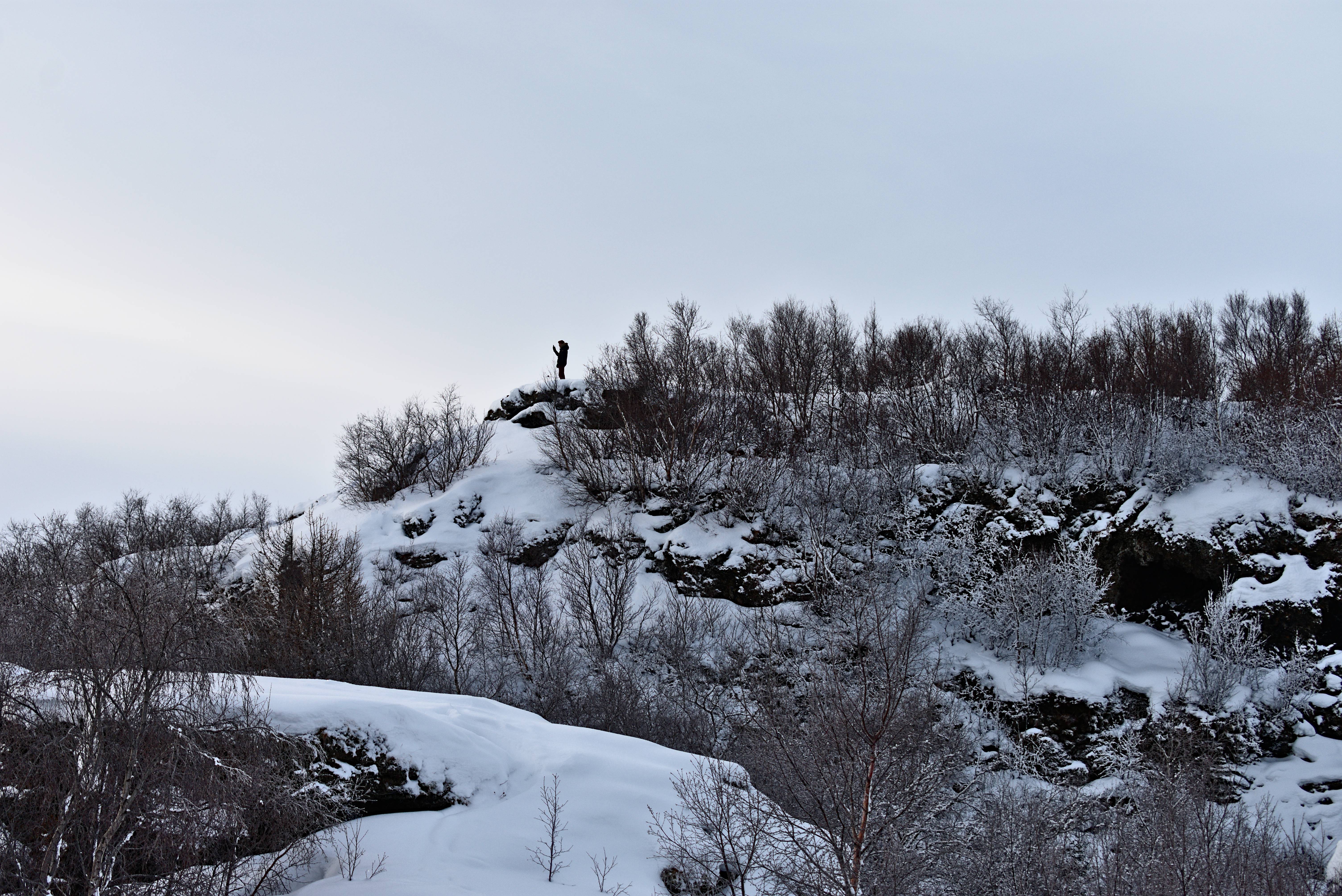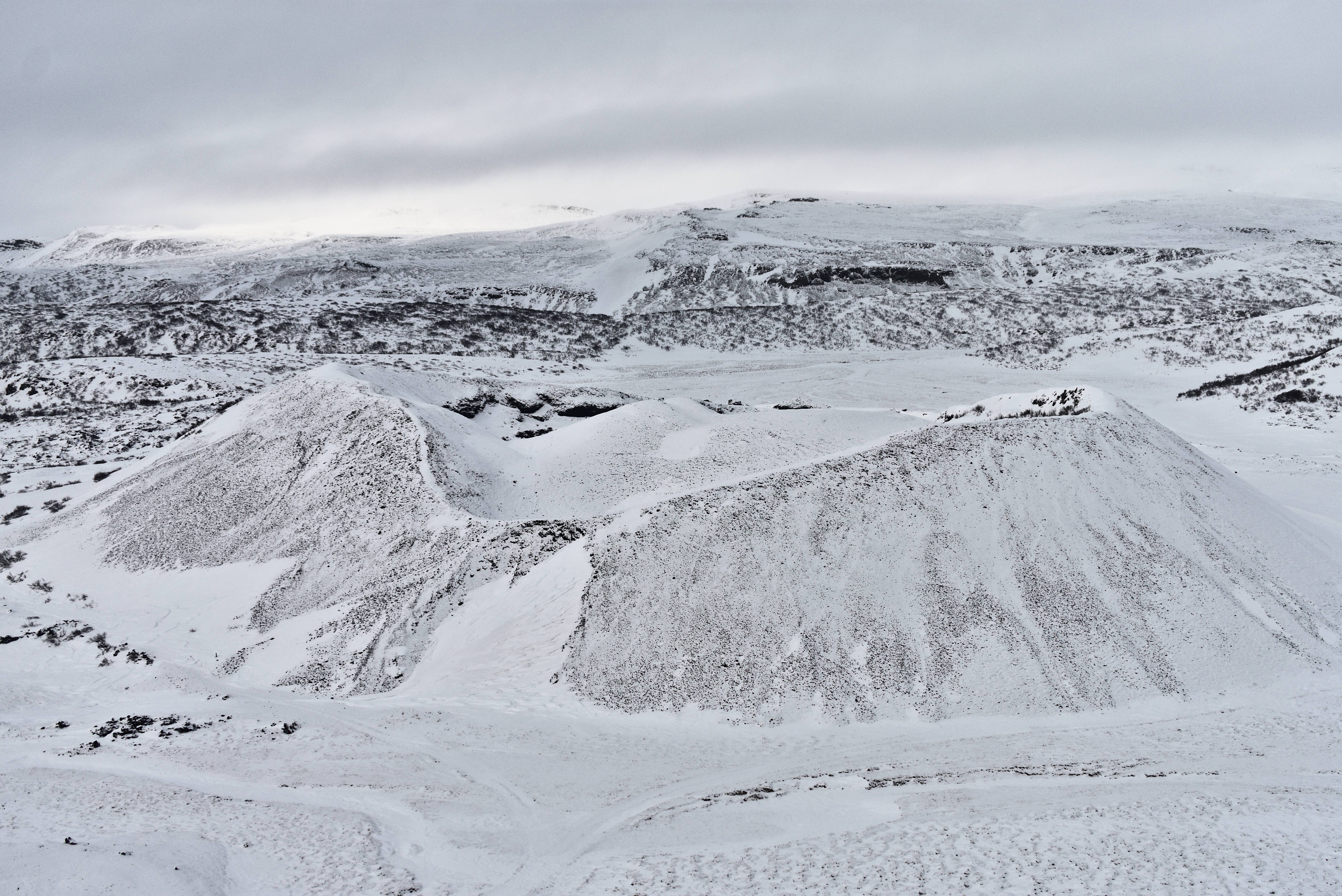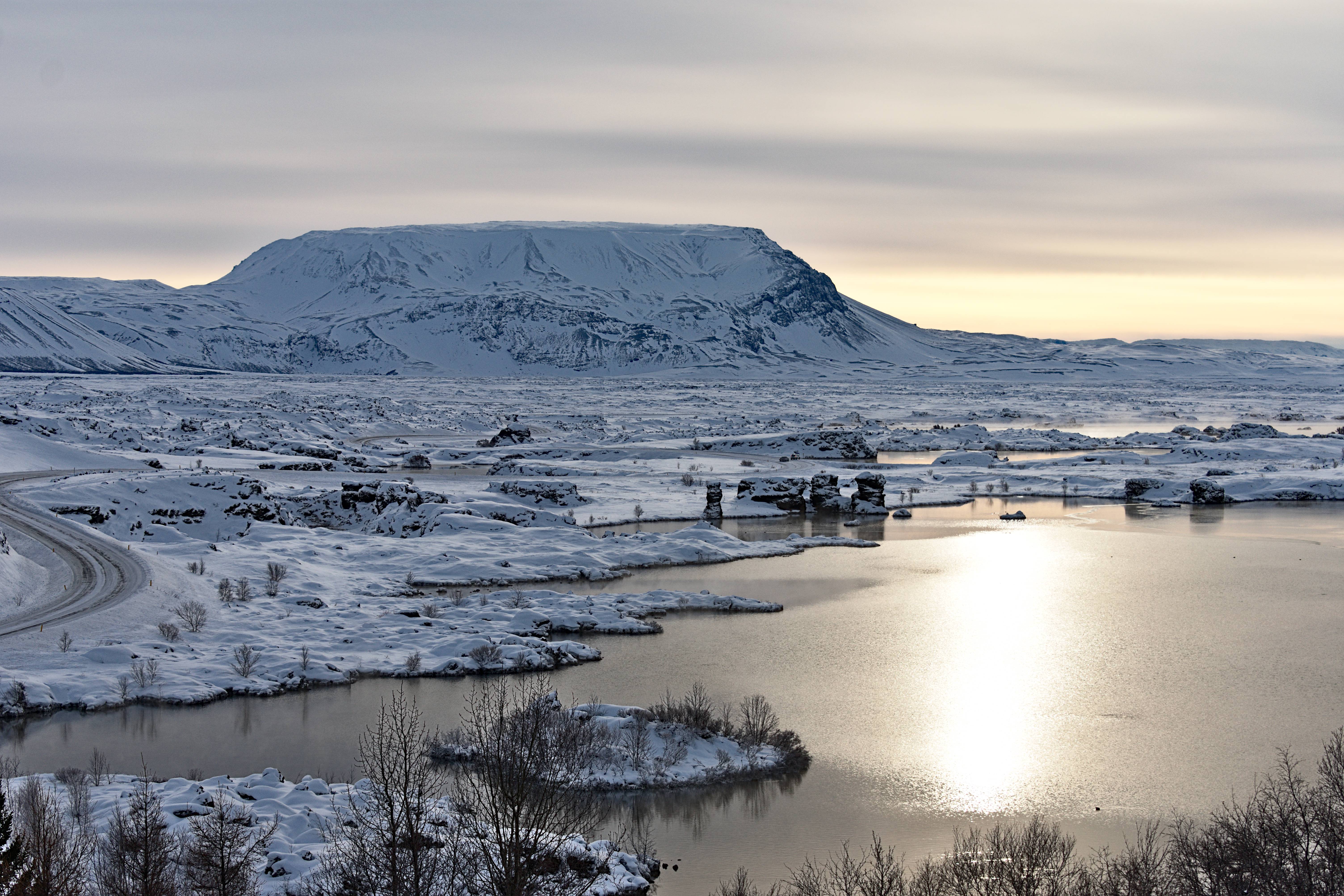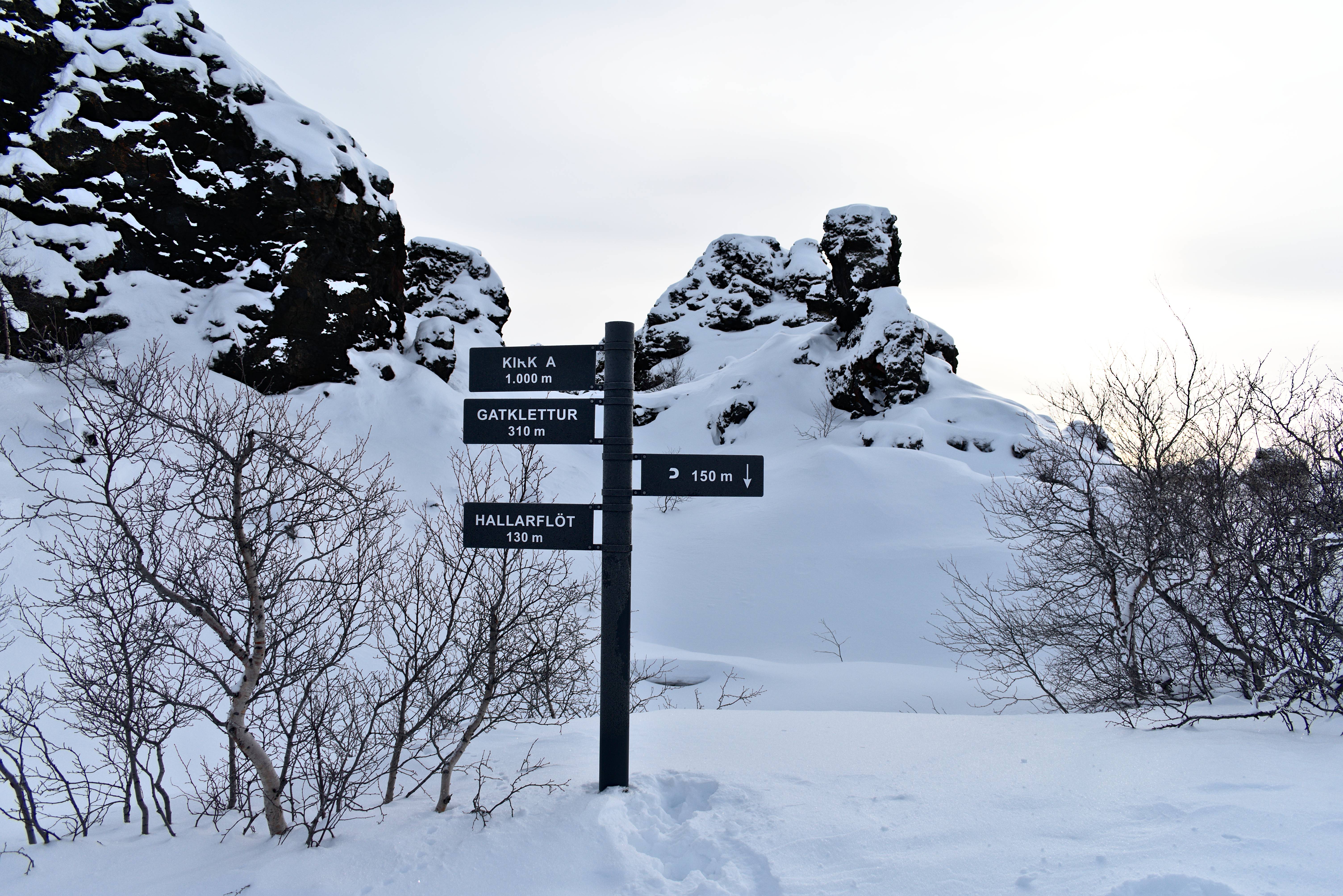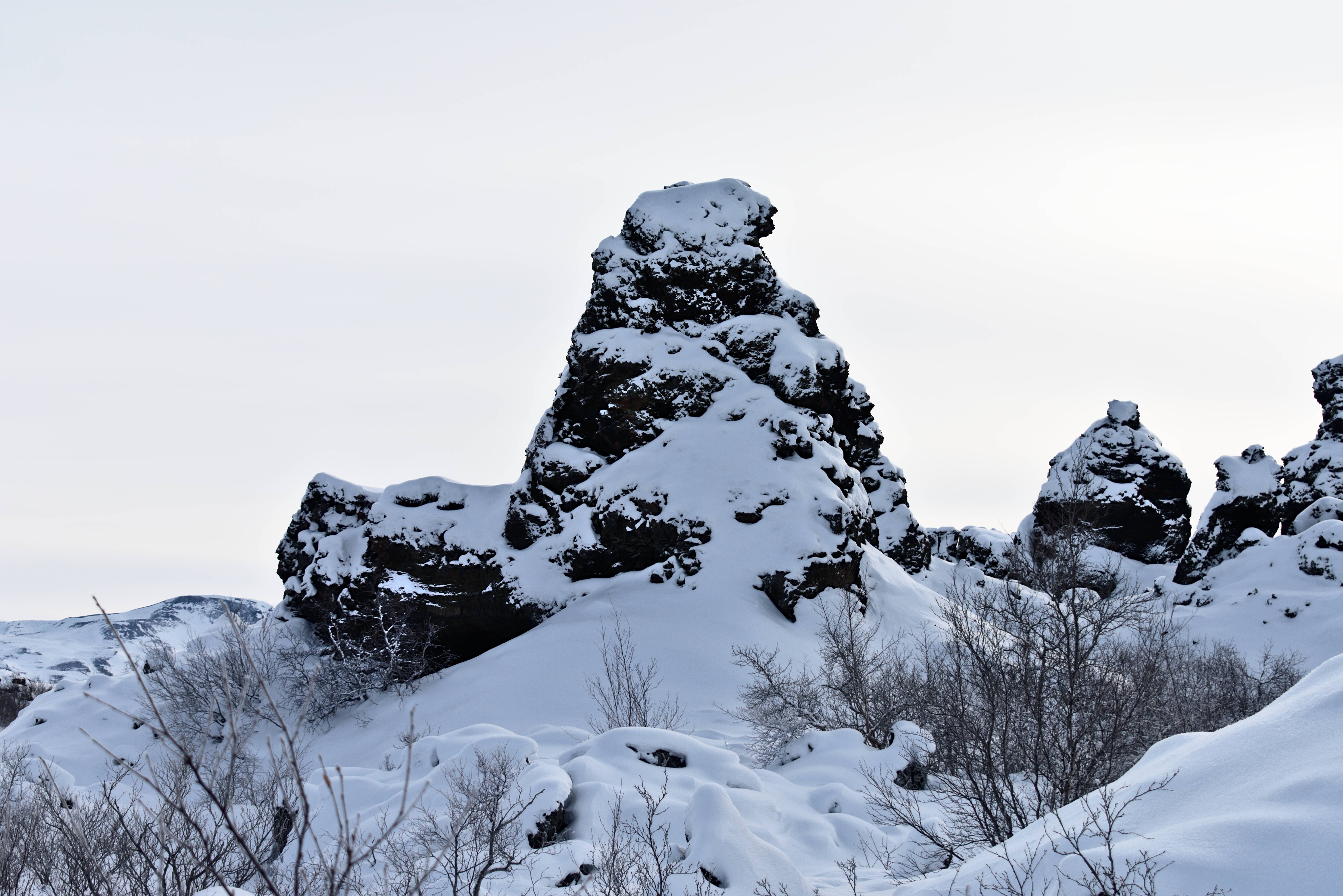 Les formations de lave de Dimmuborgir. La neige vient délicatement recouvrir ces tas de roches volcaniques. Le contraste est beau. Nous nous promenons entre ces formations naturelles.